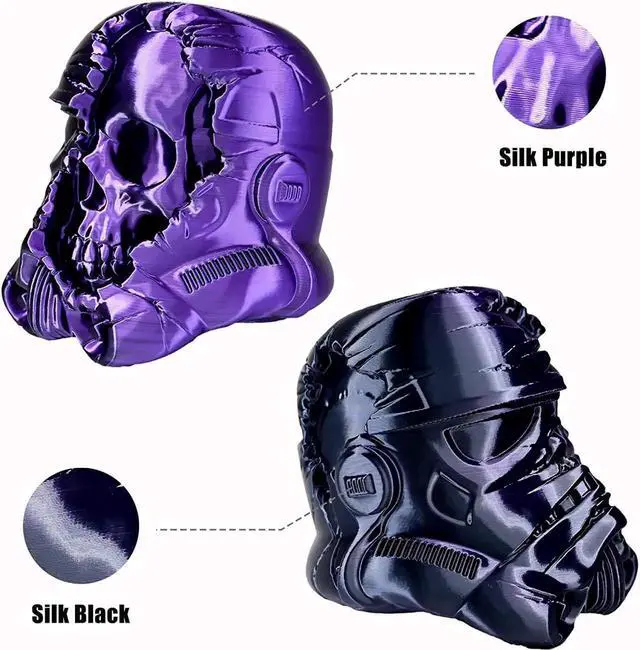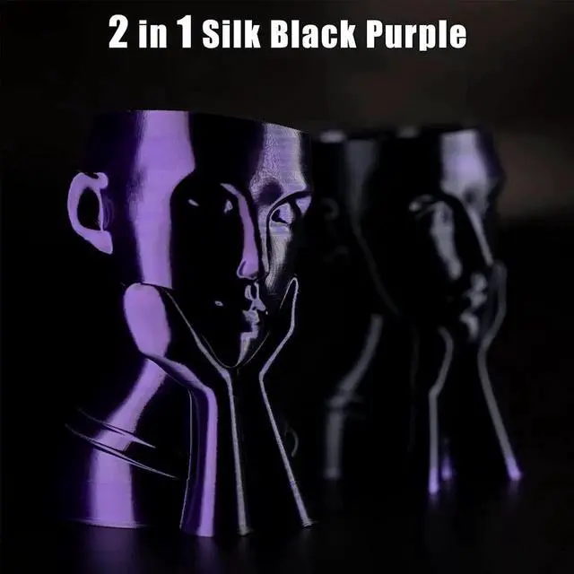 2 IN 1 BLACK+ PLA FILAMENT - Each line of this PLA filament is made up of two colors Black and Purple, so even if you print a mini-object you also get two colors. The mix of black and purple is very nice and looks cool and artistic.