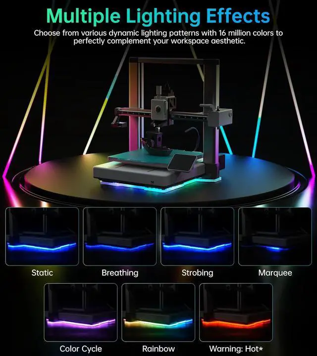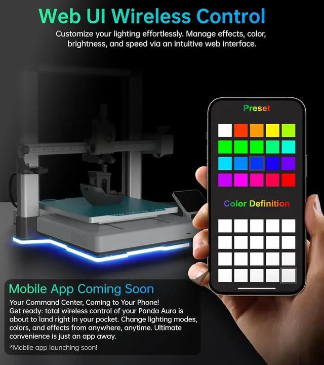 Web UI Wireless ControlYou are allowed to customize your lighting effortlessly by managing effects, color, brightness, and speed via an intuitive web interface. And the BIQU App is coming soon! The total wireless control of your Panda Aura is about to land right in your pocket. Change lighting modes, colors, and effects from anywhere, anytime. Ultimate convenience is just an app away.