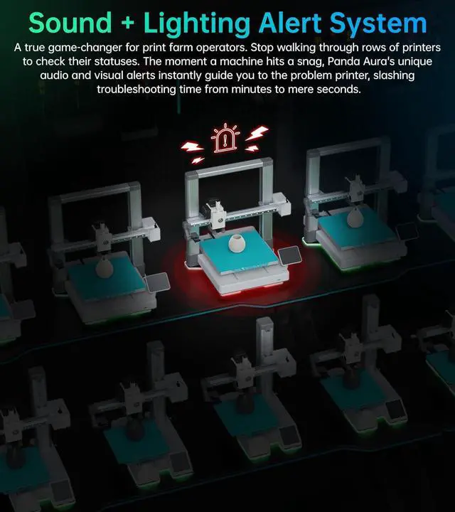 Sound + Lighting Alert SystemBIQU Panda Aura is a true game-changer for print farm operators. Stop walking through rows of printers to check their statuses. The moment a machine hits a snag, Panda Aura's unique audio and visual alerts instantly guide you to the problem printer, slashing troubleshooting time from minutes to mere seconds.