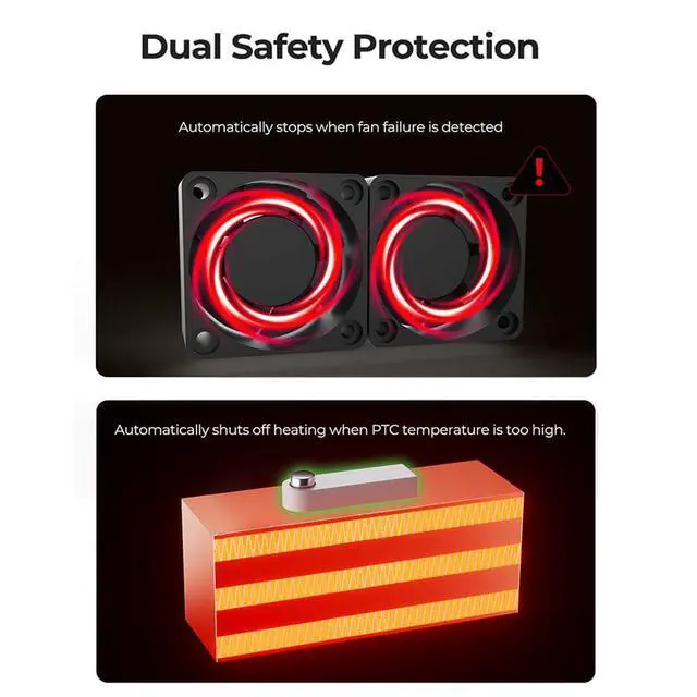 [Dual Safety Protection] Automatically stops when fan failure is detected. Automatically shuts off heating when PTC temperature is too high.