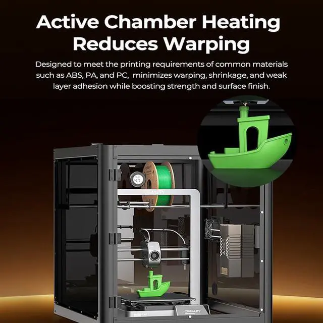 [Active chamber Heating Reduces Warping] Designed to meet the printing requirements of common materials such as ABS, PA, and PC, minimizes warping, shrinkage, and weaklayer adhesion while boosting strength and surface finish.