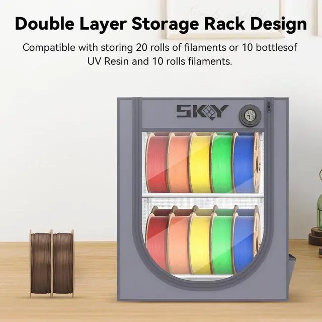 Better Choice for Storing Filaments1.Upgrade the hygrothermometer, Monitor filament conditions at any time. 2.Waterproof and dustproof, Filament maintain excellent state. 3.Surrounded by a cover, Avoid contamination and ingestion by pets and children.