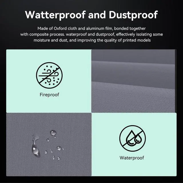 Watterproof and DustproofMade of Oxford cloth and aluminum film, bonded togetherwith composite process. waterproof and dustproof, effectively isolating some moisture and dust, and improving the quality of printed models.NOTE: To keep filament dry for a long time, it is recommended to use vacuum bags for packaging and storage.