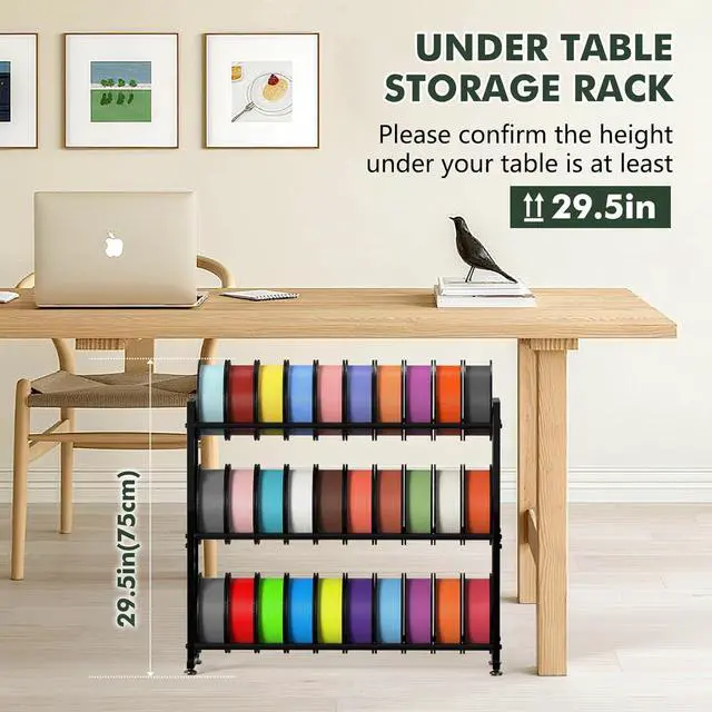 Flexible Placement With a height of 23.2 inches, the CXffvaO filament holder is shorter than most 3-tier 3D filament storage racks on the market, making it compatible with most tables (height > 29.5 in / 75 cm). You can also place the spool rack on tabletops, on the floor, keeping your filaments within easy reach