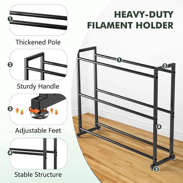 High Capacity This 3-Tier 3D filament storage rack is compatible with standard sized rolls (200 grams, 500 grams, and 1 kilogram), constructed from heavy-duty iron with reinforced crossbars for premium durability. Each shelf can support up to 80 lbs and hold 10 rolls (1kg each)
