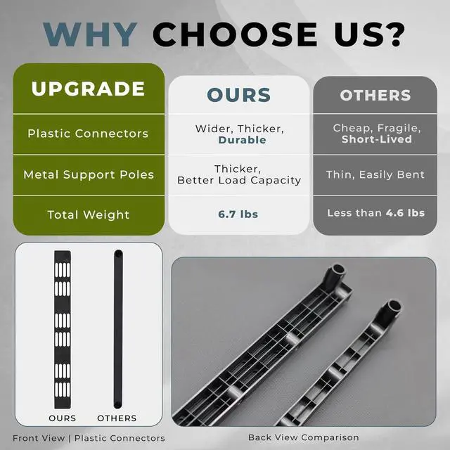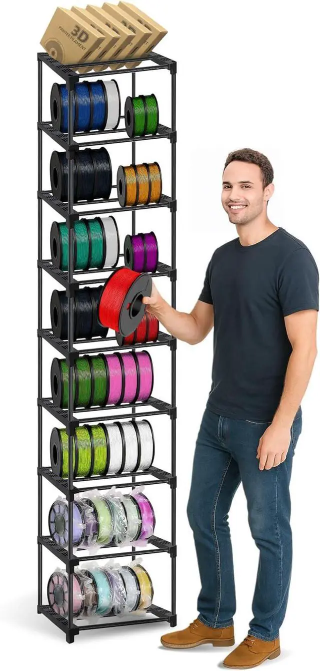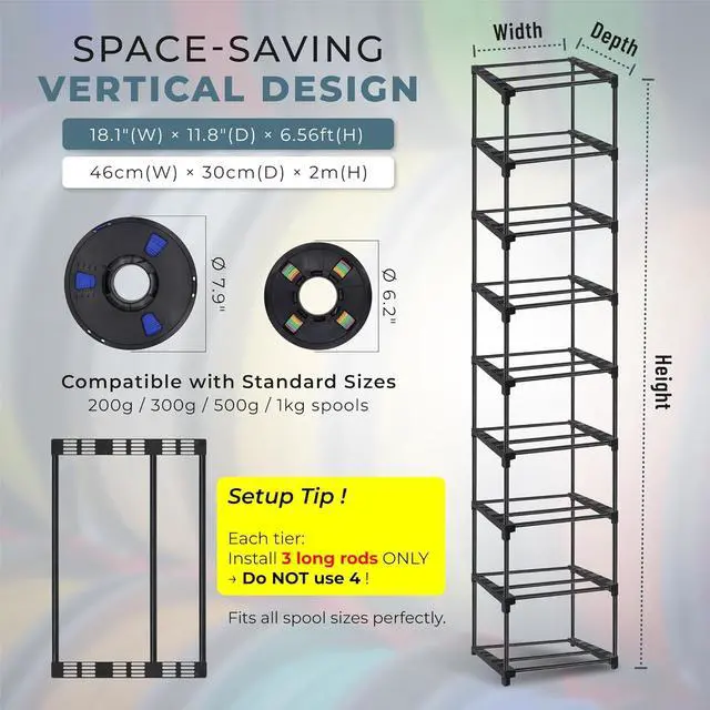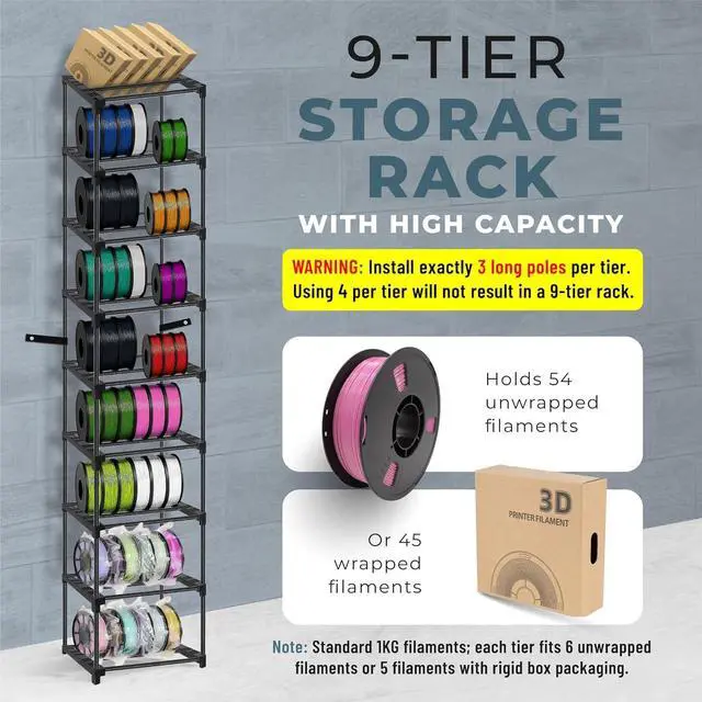 [ & | - ] Upgraded design, built with thicker plastic connectors and metal poles, it weighs 6.7 lbs totalfar sturdier than flimsy market alternatives (under 4.6 lbs) that bend easily, collapse, and spill spools everywhere. This 9-tier rack can hold 4554 3D filament spools (5/6 per tier). Perfect for large-scale storage and seamless workflow organization