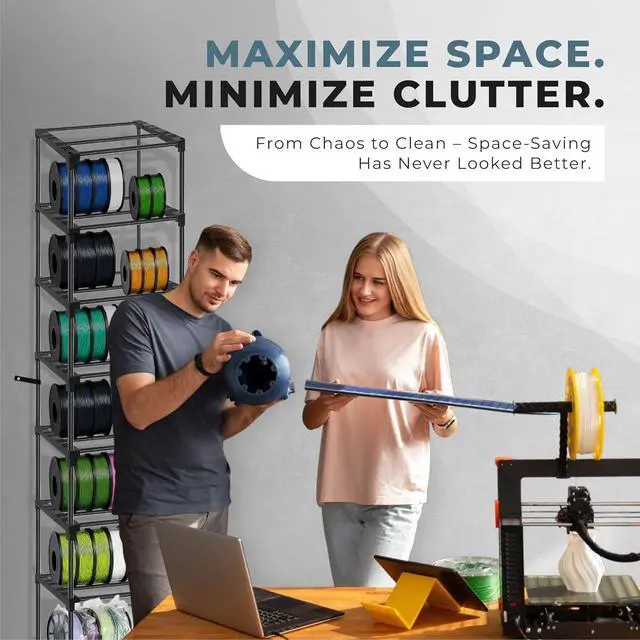 [- ] Compact 18.1W x 11.8D footprint stores 54 spools in just 1.48 sq ft (0.14). Perfect for 3D home studios, professional shops, or small businesses
