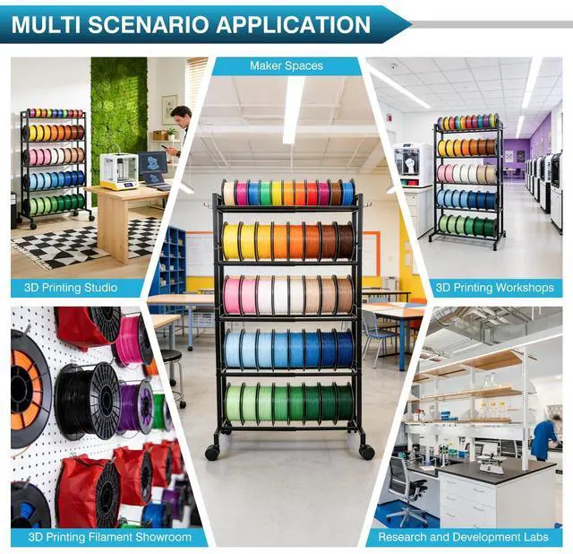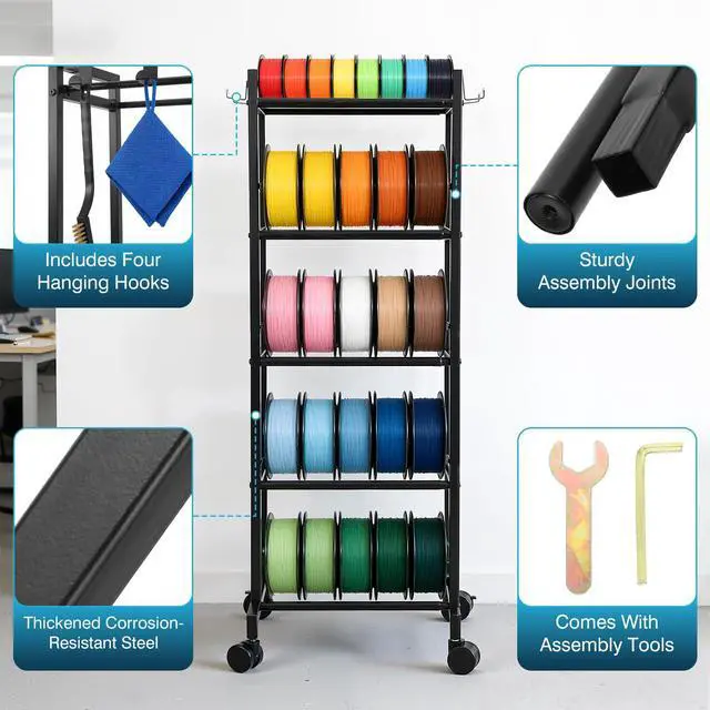 Easy Setup, Multi-Use OrganizerEasy to assemble with all necessary tools included (a wrench and hex key), this filament storage shelves rack is ideal for 3D printing workshops, offices, filament stores, and small studios. Beyond holding 3D filament spool, it also functions as a versatile organizer for sports discs, ribbon spools, and other coiled materials.