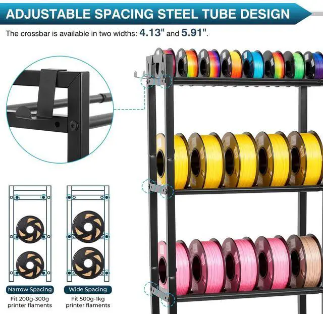 55pcs Spools Large Capacity Constructed from high hardness metal, this filament rack features adjustable width on each tiers, allowing you to set the spacing between rails to either 4.1" (For 200g-300g spools) or 5.9" (For 500g-1kg spools) to accommodate different sizes of 3D filament spools. Its large-capacity design supports organized and accessible 3D printing supplies storage.