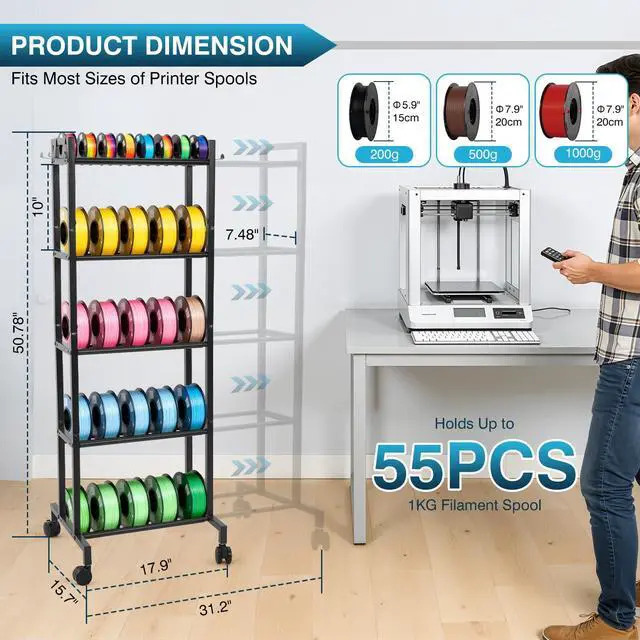Filament Rack Only Filament Not IncludedIRONWALLS 5-tier 3D printing filament storage rack is sold as a standalone storage solution; the filament spools shown in images are for display purposes only and are not included. The overall dimension of this filament Shelf is 31.2"(L) x 15.7" (W) x50.8"(H). (The width referred to here is the width of the bottom bracket, not the width of the crossbar for placing spools)
