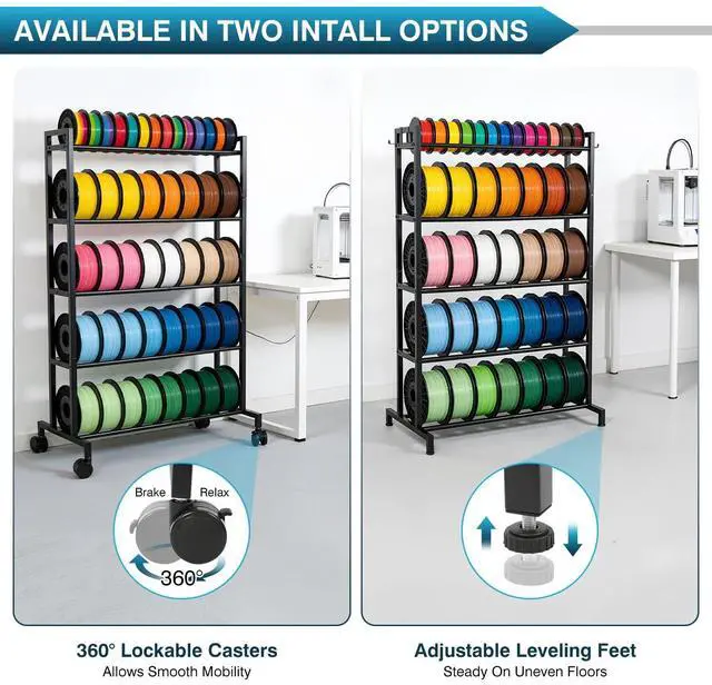Rubber Feet or Locking Casters Flexible OptionsChoose between two base options: height-adjustable non-slip rubber feet for stable placement, or lockable swivel casters for easy mobility. This makes our3d filament holder rack an adaptable storage solution for 3D printing accessories, whether stationary in a craft room or on the move in a busy studio.