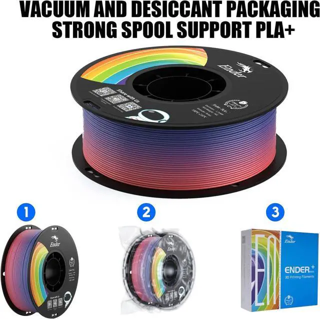 BUBBLE FREE: Creality rainbow 3D printing filament pro vacuum sealed with desiccants in a transparent bag.