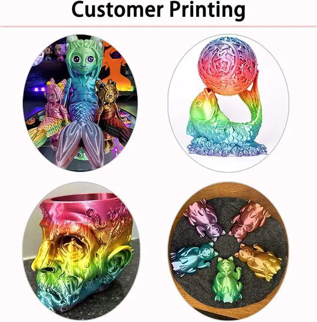 PLA FILAMENT SILK MULTICOLOR - Fast 5 colors change with blue, green, yellow, pink and purple, so you can get all colors in one object-about 200g. The color transition is natural and beautiful and the silk filament has excellent gloss.
