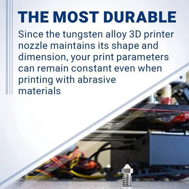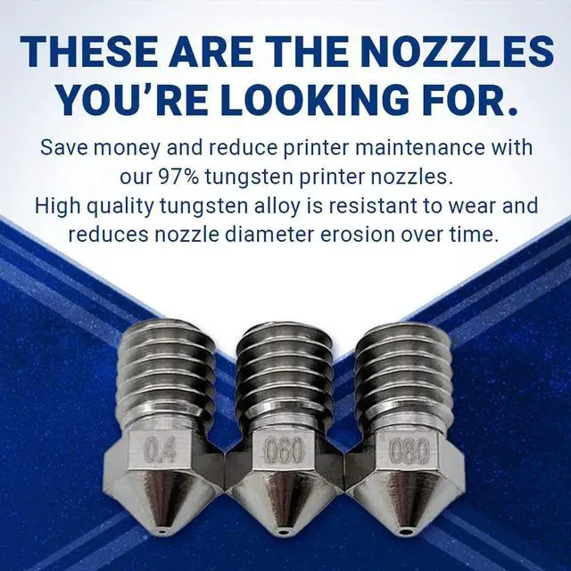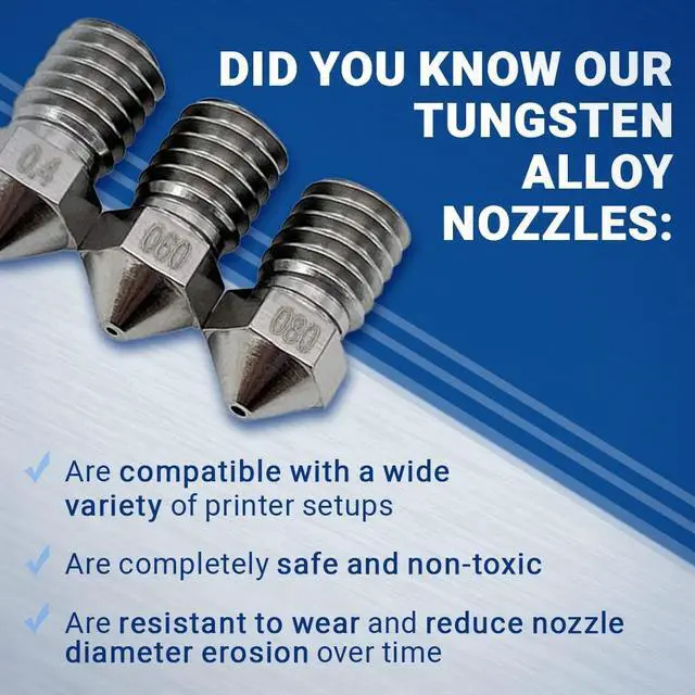 Compact Sizes: Our tungsten nozzle size are 0.8 mm in diameter to suit various printing needs. While the 0.8 mm sizes are ideal for larger and faster prints and its size is perfect for fine and detailed prints.
