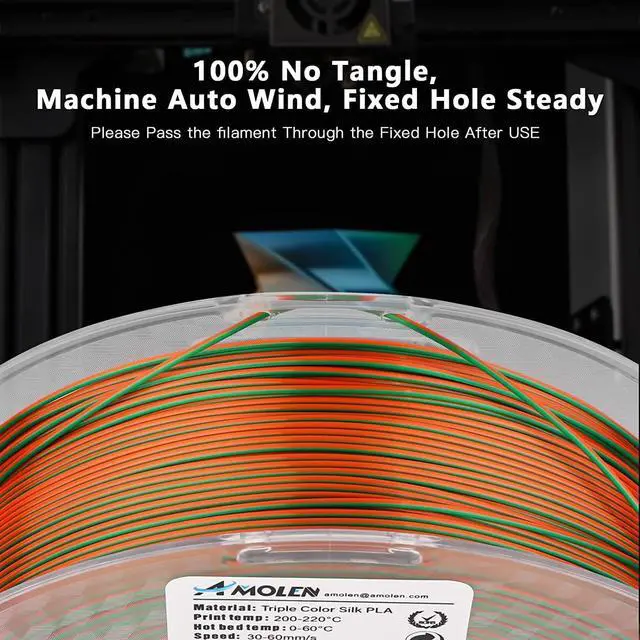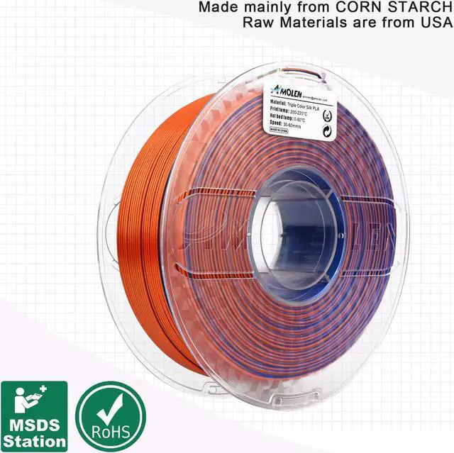Premium Quality Filament- AMOLEN Silk Shiny Tri-colors PLA filament Raw materials are from USA. Good shaping, strong toughness, no bubble, no jamming, no warping, melt well, feed smoothly and constantly without clogging the nozzle or extruder.