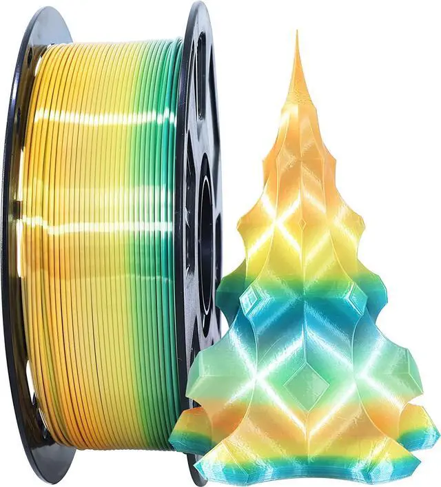 Colors: Silk Yellow, Silk Orange, Silk Lime Green, Silk Dark Green; This Unique Shining Luster Multi Colors, To Support You to Print Shiny Multi Beautiful Different Amazing Colors in One Spool Filament, It' s Very Suitable for Printing Beautiful Objects as Gift