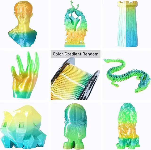 Green Yellow Type Rainbow Silk PLA: This Multi Colored Silk PLA is Color Change Quite Fast, Around Each 5-10 Meters Change Color Random Gradually, which Much Faster Compare Others Rainbow PLA in Market; It' s Include Mainly 4