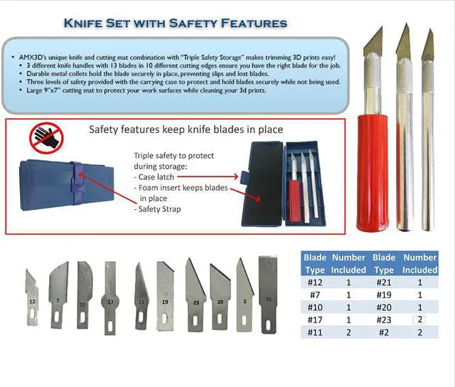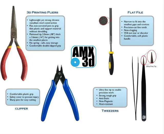 PRINTING: A large variety of accessories for the 3D Printing beginner, modeler, or hobbyist. The perfect companion kit to any 3D printing system. Picked for function and value, these Hobby-grade tools were selected, designed, assembled and are supported by AMX3d in Lisle, Illinois.