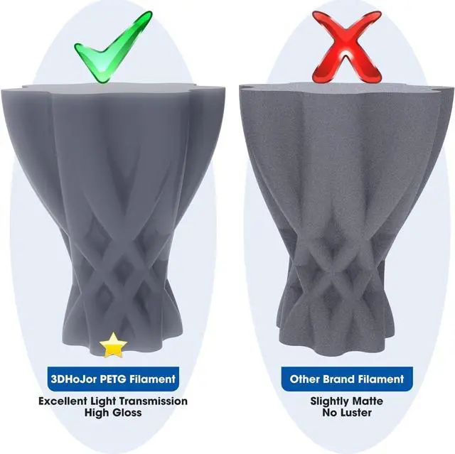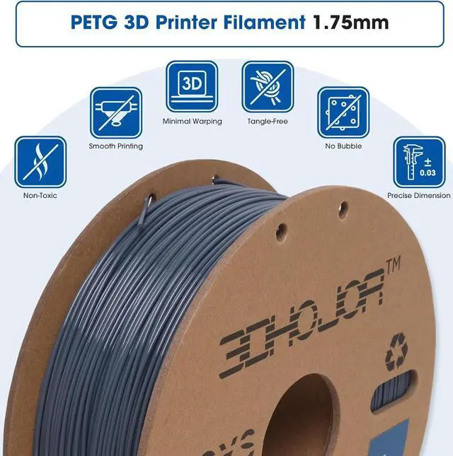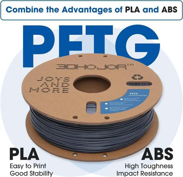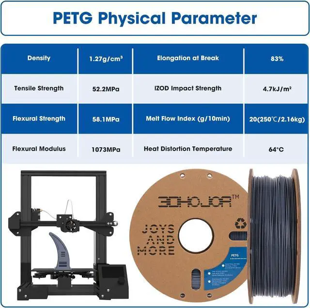 Toughness Enhanced PETG FilamentGood toughness that not easy to break, high purity environmental raw material leading smooth extrusion continuously fluent flow and no clogging. Strong adhesion and low shrinkage of 3D Printer Filament allows smooth first printing layer. High Precision. Excellent Clarity & Light Transmission. High Gloss. Excellent Impact Strength.