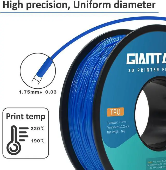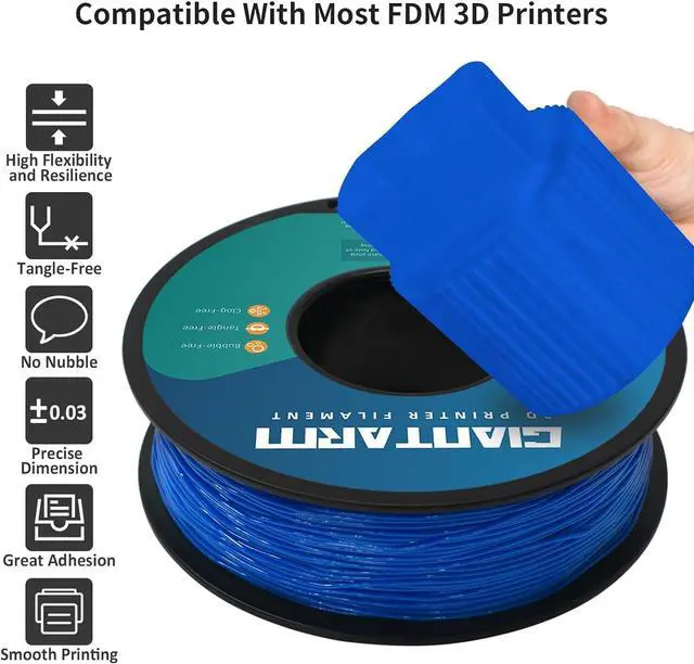• Soft Filaments of High Elasticity--- GIANTARM TPU 95a is a thermoplastic polyurethane (TPU) based filament specifically engineered to work on most desktop 3D printers. It has a shore hardness of 95A and can stretch 3 times more than its original length. Excellent bed adhesion, low-warp and low-odor, make these 3d printer filament tpu easy to print.