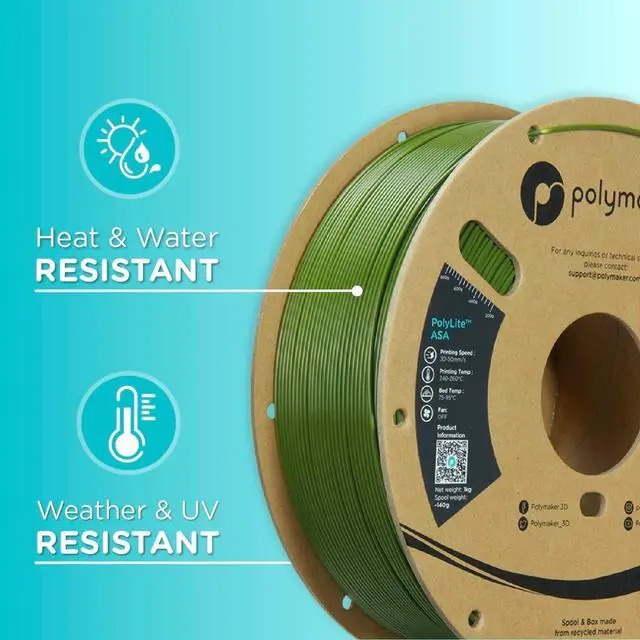 • Weather Resistant: Polymaker PolyLite ASA 3D printing filament combines the properties of ABS with added weather resistance. UV-resistant and less prone to environmental stress cracking, its ideal for outdoor applications like RC planes and car accessories.