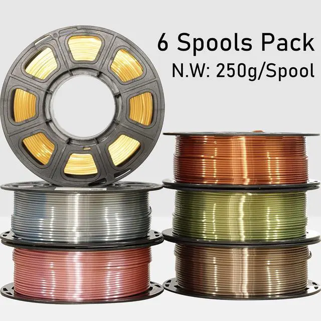 6 in 1 Metallic Silk Shiny PLA Filament Bundle: It Included 6 Most Popular Metallic Silk Shiny Luster Colors: Metallic Silk Gold/Silver/Copper/Bronze/Coffee/Rose Gold. Each Spool Filament Net Weight is 0.25 kg, 6 Spools Packed, Total is 1.5K g 3D Printing Material, These Colors Are Very Suitable to Print Beautiful 6 Different Metallic Shiny Colors 3d Print Objects, It' s Great Sample Pack for 3D Printing