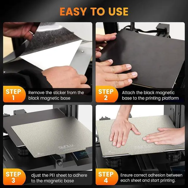 Excellent adhesionSUNLU PEI Magnetic Sheet has excellent magnetic, adhesion, and elasticity. The printing surface can effectively adhere to various printing materials. Compared with traditional 3D printer bed, it can better prevent edge warping. You can easily remove your printed model by bending it slightly, which is efficient and useful.