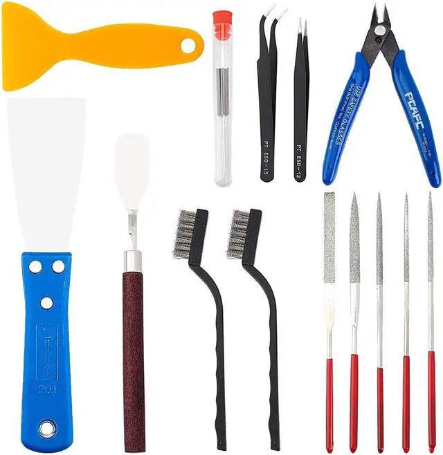 What You Get--Here come with 1pc stainless steel putty knife, 10pcs 0.2 mm, 0.25 mm, 0.3 mm, 0.35 mm, 0.4 mm cleaning needles, 2pcs wire brush, 1pcs wire flush cutters, 1pcs scraper knife, 5pcs graining burnishing tools, 1pc plastic scraper tool, 2pcs tweezers.
