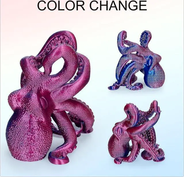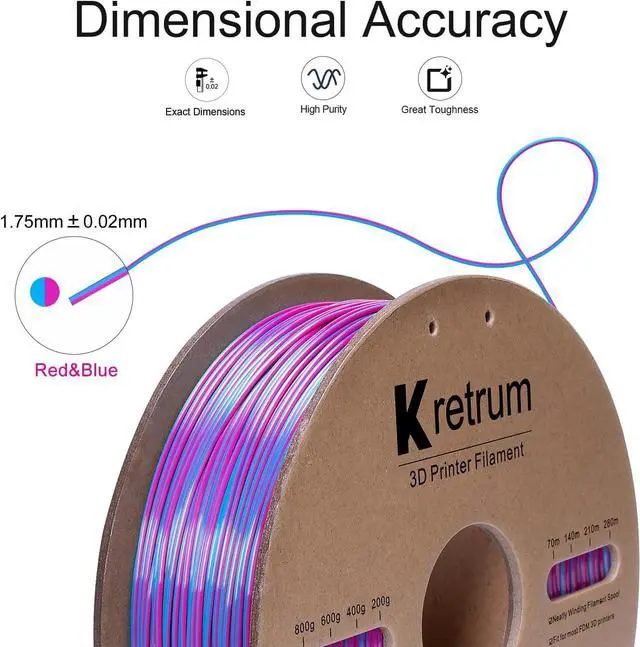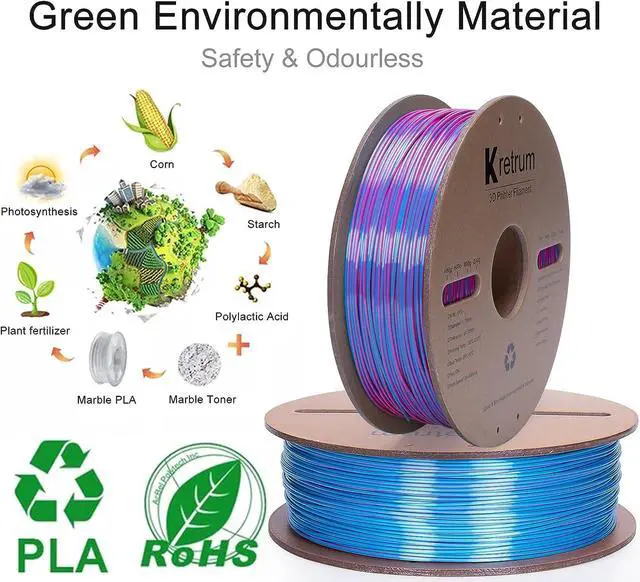 Dual-color Silk PLA Filament: Kretrum Blue & Purple dual color 3D silk filament color change at different angles, smoothly color transitioning with shiny high-gloss surface and silk texture, this dualcolor filament will offer you a magic amazing 3D print object, suitable for printing decorations, artwork, gifts