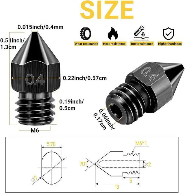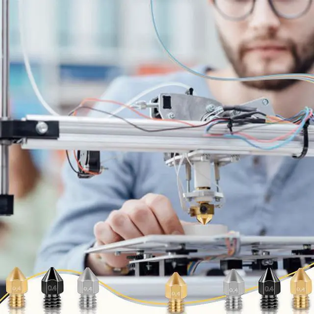PACKAGE INCLUDES - You will get 45 pcs Mk8 nozzles with Mk8 nozzle bras ( 0.1, 0.2, 0.3, 0.5, 0.6, 0.8, 1.0 mm)*2+ 0.4 mm*16, Mk8 stainless steel 3D printer nozzles 0.4 mm*8+ 0.5 mm*2+1. 0mm*1, Mk8 hardened stainless steel nozzles 0.4 mm*4 and also curved tweezers*1, straight tweezers*1 L wrench*1, open end wrench*1, hard cleaning needle 0.15 *5 pcs, brush*1.