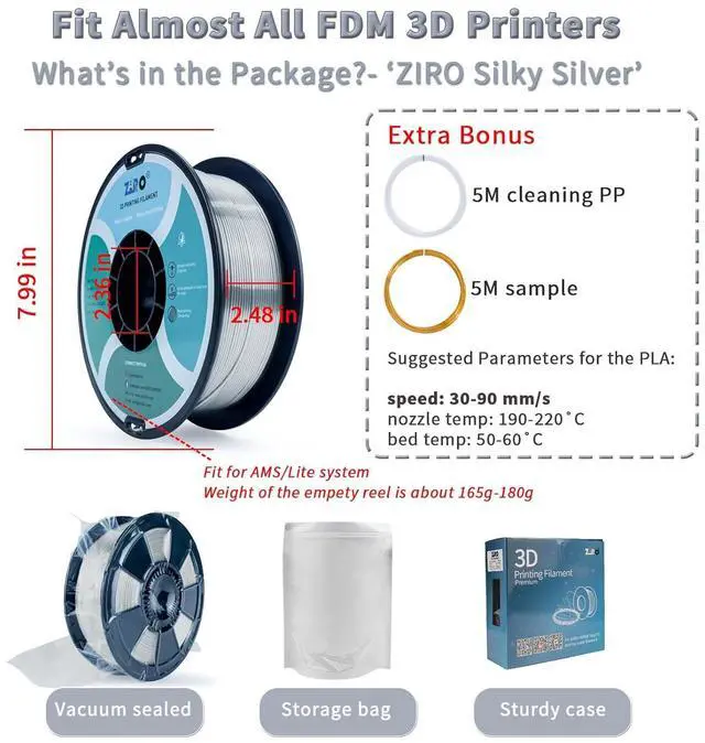 [Neatly Wound and Tangle-free]-Our ZIRO filament uses full mechanical wire winding to avoid tangles and knots during printing. And completely drying for 24hrs before vacuum sealed. Moisture-free and bubble-free to make 3d printing much easier. (Please remember to store the filament with the re-sealable bag after use to keep it dry)