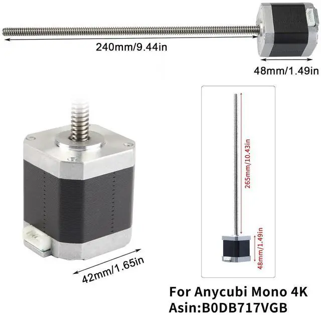 Note: Threaded rod is about 240mm/ 9.44 in, please Re-Measure your original motor' s lead screw before ordering to avoid wrong buy. According to our customer' s need, we have another new LONGER screw stepper motor as a replacement for Anycubi Photn Mono4K for a full print, please search