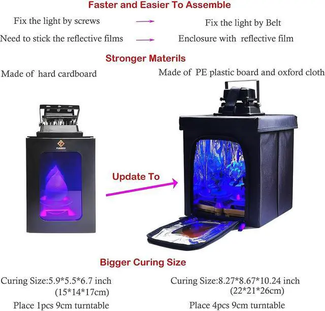 1: Big Curing SizeUpdate to 8.27 " x 8.67 " x 10.24 " (21*22*26CM) enough for model from 10.1 inch or small LCD Printer to use.