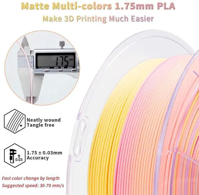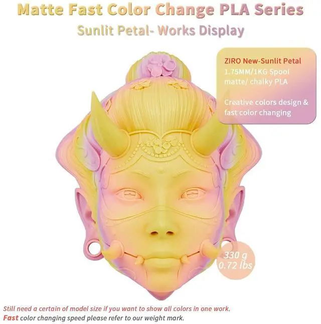 [Fast Color Change Matte PLA]- The ZIRO " Sunlit Petal" combined multiple colors in one matte pla filament. Higher-cost production technology to achieve the true faster color changing aim. The matte surface offers a no shine look, giving your 3D works a unique style.