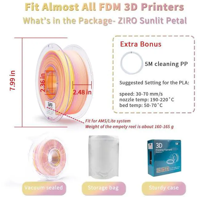 [What You Will Get]- 2.2 lbs Sunlit Petal + a free reseal bag + a 5M cleaning filament. If you are looking for amazing color design PLA, the ZIRO Sunlit Petal is your go-to choice.