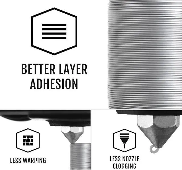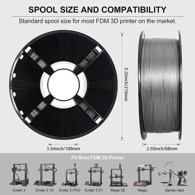 Metallic Finish Color&High QualityThe special color of PETG Filament brings arts & crafts and 3D Projects Smooth Metallic Silver Surface which definitely gives eye-catching, glossy prints. With no post polishing needed, you can instantly design prints with a dynamic metal-like finish. It' s very suitable to print decoration or gift for all kinds of festival and cosplay. This filament Anti-warping, high accuracy, no bubble, no jamming and no drawing.