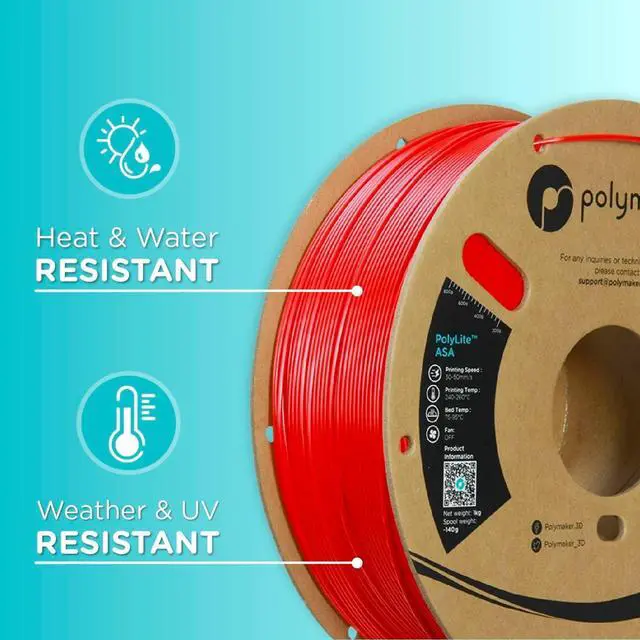 Weather Resistant: Polymaker PolyLite ASA 3D printing filament combines the properties of ABS with added weather resistance. UV-resistant and less prone to environmental stress cracking, its ideal for outdoor applications like RC planes and car accessories.