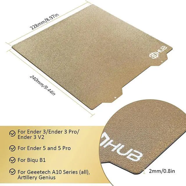 APPLICABLE MODEL 235mm*235mm Bed Size fit Creality Ender 3/3 pro, Ender 5, Creality CR-20/CR-20 Pro, Geeetech A10 Series (all), Artillery Genius. Compatible with PLA, PETG, ABS and most other filaments.