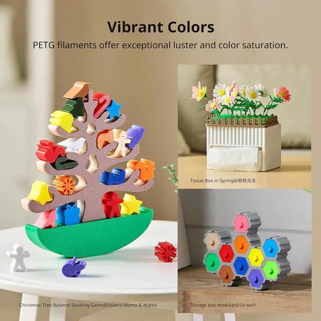 Durable & Impact-resistANYCUBIC PETG Filament combines the PLA' s ease of printing with the toughness of ABS. With impact resistance twice that of standard PLA. Models maintain structural integrity even when dropped or under stress. Making it an excellent choice for toys, chassis, and mechanical prototypes.