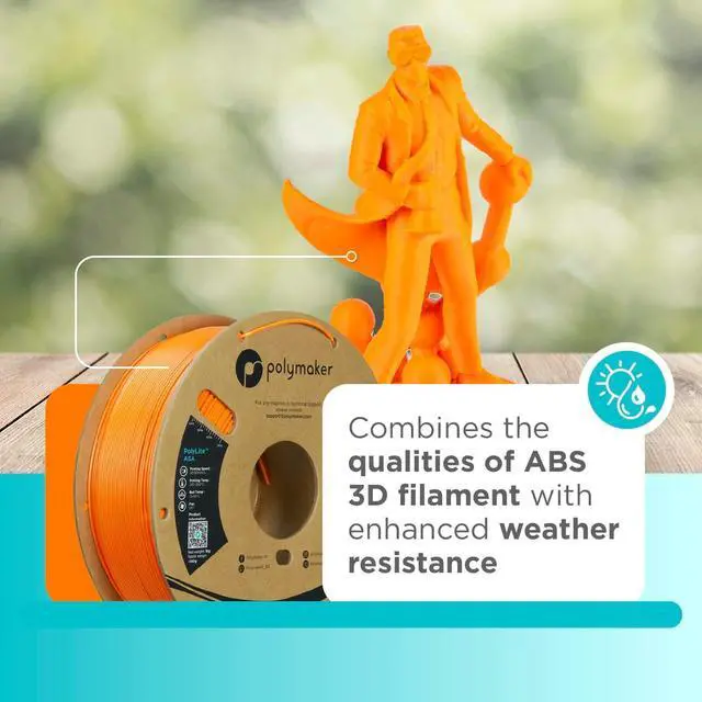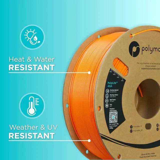 • Weather Resistant: Polymaker PolyLite ASA 3D printing filament combines the properties of ABS with added weather resistance. UV-resistant and less prone to environmental stress cracking, its ideal for outdoor applications like RC planes and car accessories.
