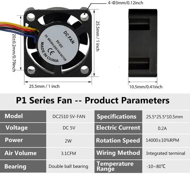 3D Printer DC5V 2510 Extruder Hotend Cooling Fan for Bambu Lab P1P/P1S, 25x25x10mm 0.2A Current for 3D Printer, Cooling Fan 3D Printer Accessories Parts with 70mm Cable Line and 14000 ± 10%RPM