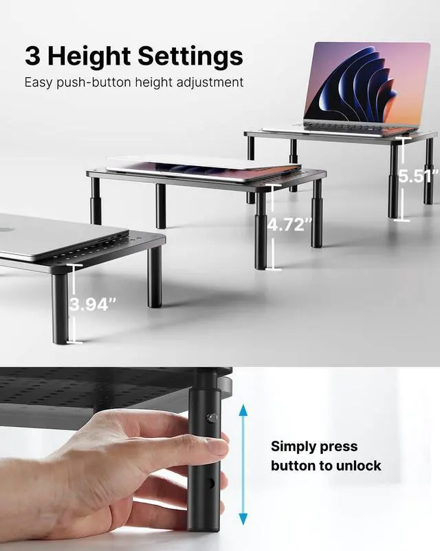 • ERGONOMIC HEIGHT ADJUSTMENT: This monitor stand features 3 height settings at 3.94, 4.72, and 5.51 tall. Choose the most comfortable and ergonomic viewing height by pressing the buttons on the legs to adjust the stand.