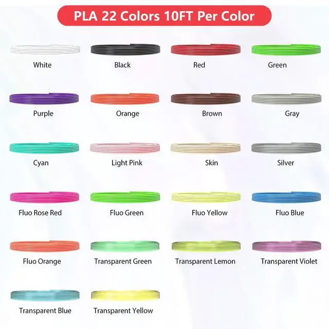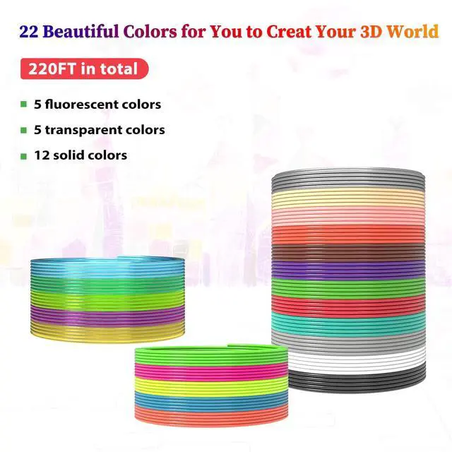 3Dgenius 3D pen filament refills comes with 22 colors, each color 10 feet, totally 220 feet for you to create your 3D drawing world. The 3D pen filament has premium quality controlling, there will be no bubbles and blocking while drawing. And the fast forming will bring you happy and smooth drawing experience.
