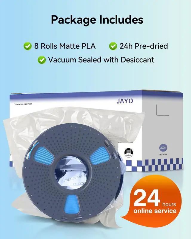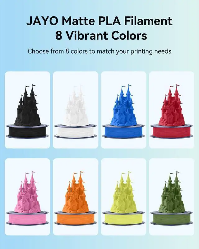 2KG TOTAL, 0.25KG per SPOOL, 8 ROLLS: JAYO 1.75mm matte PLA Filament is available in 8 colors: Black, White, Blue, Red, Pink, Orange, Light Yellow, Olive Green. 250g spools are perfect for users with multi-color needs, making them an excellent addition for sampling colors with your 3D printer or 3D pen.