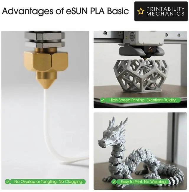 • Improved and upgraded based on ordinary PLA (Polylactic Acid), eSUN PLA Basic keeping all the advantages of PLA, easy to print just like ordinary PLA.