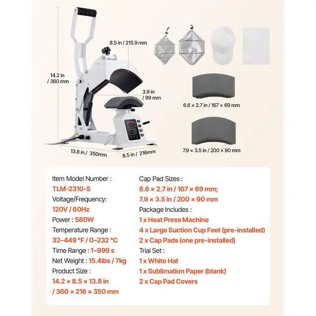 Cap Pad Sizes: 6.6 x 2.7 in / 167 x 69 mm; 5.9 x 3.0 in / 150 x 76 mm