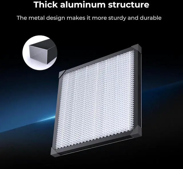 Thick All Metal Structure: The Laser honeycomb bed is composed of an aluminum honeycomb grille and a metal frame. It is very lightweight and easy to move. The honeycomb structure is fixed by multiple metal columns, making it more sturdy and less prone to deformation.