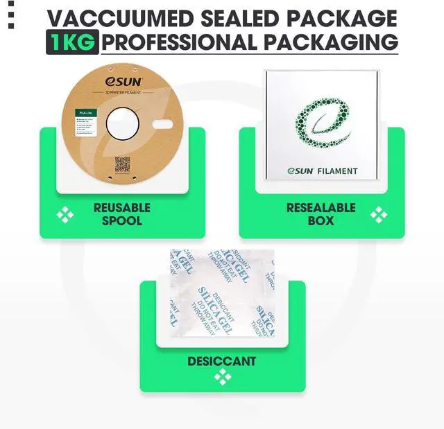 100% Vacuumed Sealed Packaging: Complete drying for 24 hours before packaging, eSUN filament comes in a sealed vacuum bag with a desiccant bag to keep it dry and prevent from dust and foreign particles, avoid nozzle jams and yield smooth 3D models