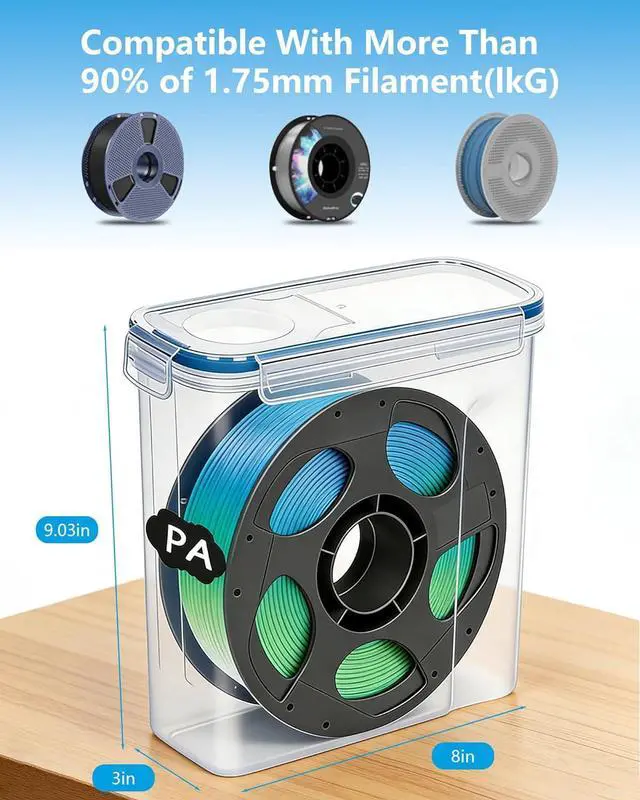 Airtight and Moisture-Proof, All-Season Protection for Filament. Equipped with a snap-lock lid, reinforced corners, and a continuous silicone sealing gasket, this storage box creates an effective barrier against moisture, dust, pests, and accidental spills. It keeps PLA, ABS, PETG, TPU, and other filaments dry, clean, and ready for printing, ensuring consistent material performance and higher performance for every print job.