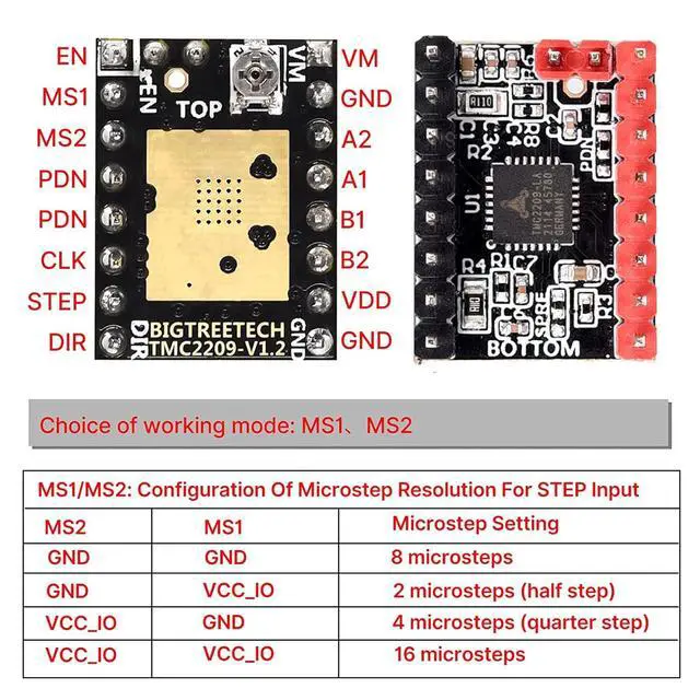 BIGTREETECH TMC2209 V 1.3 is an ultra-silent motor driver IC for two-phase stepper motors, which adopts stealthChop2 Mute technology which reduces motor noise to the point of silence at low velocities to ensures noiseless operation, maximum efficiency and best motor torque. spreadCycle allow for highly dynamic motion. Drive current 2A, peak current 2.8A, voltage range 4.75V -29V, 256 subdivision